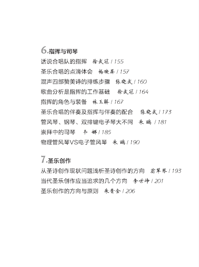 “圣乐事奉是一个喜乐又永恒的话题,是一项神圣又美妙的事工。我们应该让圣乐教育普及教会所有的信徒,不只停留在神学院校和诗班培训。应让所有的信徒认识圣乐在教会事奉中的重要性,让会众都能承担起在崇拜中的角色。希望本书的出版能够推动中国教会圣乐事工的发展,出现更多的圣乐人才,使更多人能够得到造就。让我们共同努力,建立更美的圣乐事奉。”